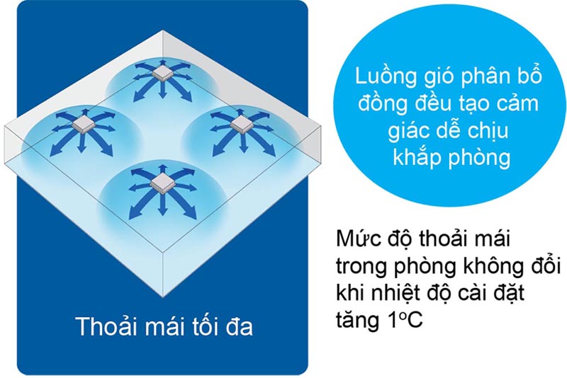 Phân bổ nhiệt độ đồng đều tạo cảm giác dễ chịu khắp phòng. Mức độ thoải mái trong phòng không đổi khi nhiệt độ cài đặt tăng 1°C