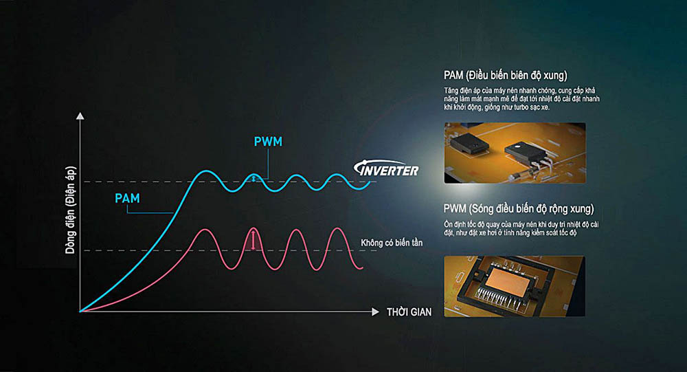 Chế độ PWM (Sóng điều biến độ rộng xung) giúp ổn định tốc độ quay của máy nén khi duy trì nhiệt độ cài đặt.