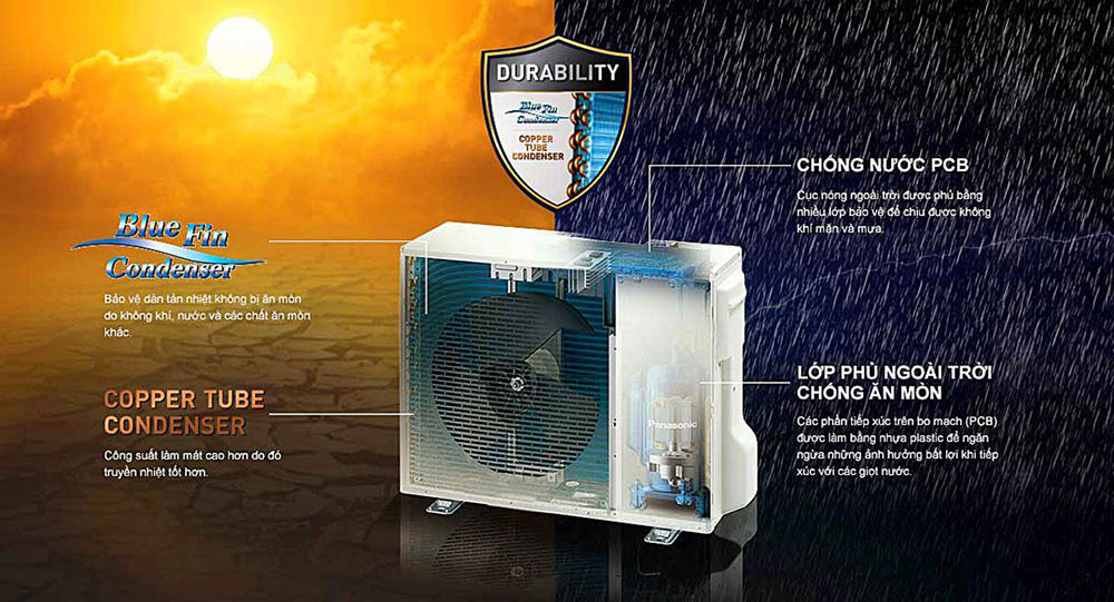 Máy lạnh Panasonic Inverter với Model Cu/Cs-XU-UKH có cánh giải nhiệt màu xanh giúp bảo vệ dàn giải nhiệt không bị ăn mòn do không khí, nước và các chất ăn mòn khác. Các phần tử tiếp xúc với Board mạch được làm bằng nhựa plastic để ngăn ngừa những ảnh hưởng bất lợi khi tiếp xúc với các giọt nước.