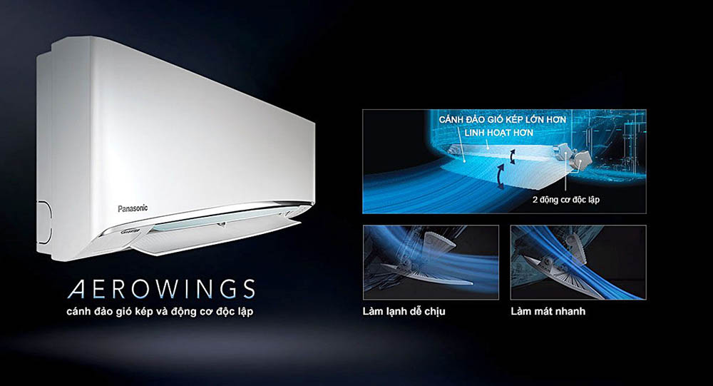 Luồng gió thổi kiểu AEROWINGS với 1 cánh lá đảo lớn và 1 cánh lá đảo nhỏ phía trong được điều khiển bởi 2 động cơ độc lập. Luồng gió được thổi ra với tốc độ nhanh hơn, lan rộng hơn và quan trọng là không thổi vào người sử dụng. Với 2 chức năng điều chỉnh có thể Làm mát nhanh hoặc làm mát dễ chịu, tạo cảm giác sảng khoái hơn.