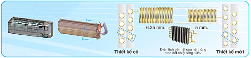Cải tiến thiết kế với ống đồng thu nhỏ lại dẫn đến số lượng ống đồng và lá nhôm tăng lên nhiều hơn làm gia tăng diện tích bề mặt tiếp xúc giúp sự trao đổi nhiệt diễn ra nhanh hơn nên máy điều hoà có khả năng làm lạnh cực nhanh.