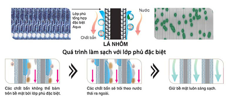 Dàn lạnh Máy lạnh Toshiba inverter 1.5hp được phủ một lớp tổng hợp Apua đặc biệt, hệ thống trao đổi nhiệt sẽ hấp thụ và loại bỏ hoàn toàn bụi bẩn vi khuẩn, nấm mốc và các chất bẩn này sẽ trôi theo nước thải ra ngoài.