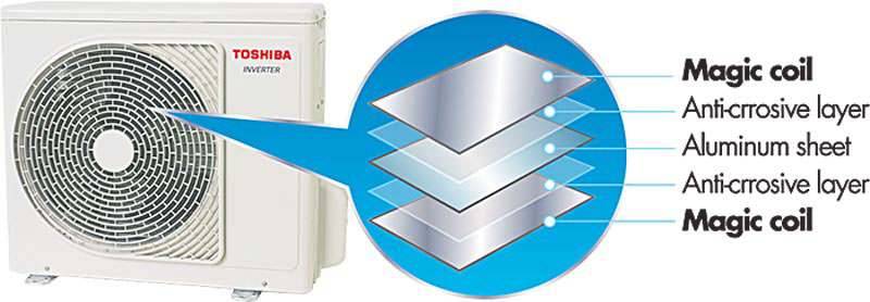 Dàn nóng ngoài trời được xử lí với công nghệ chống ăn mòn hiện đại làm tăng độ bền và tuổi thọ, đặc biệt thích hợp ở những vùng có nồng độ muối cao trong không khí.