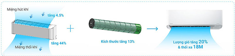 Nhờ thiết kế mới với kích thước tăng lên của miệng hút khí và miệng thổi khí cùng với thiết kế cánh quạt hình xiên mới & đường kính quạt tăng lên 13% giúp luồng gió thổi mạnh hơn, xa hơn đến 18m.