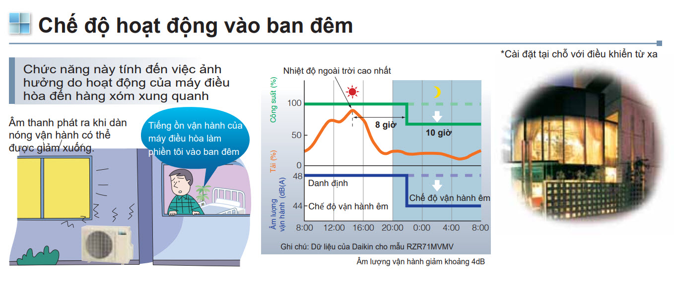 Chức năng này tính đến việc giảm thiểu tối đa ảnh hưởng độ ồn do hoạt động của dàn nóng máy điều hòa đến phòng ngủ và hàng xóm xung quanh vị trí lắp dàn nóng.