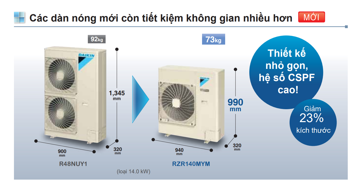 So với model không Inverter trước đây, dàn nóng mới nhỏ gọn hơn với chiều cao chỉ còn 990mm. Dễ dàng lắp đặt ở những nơi không gian bị giới hạn, trong khi vẫn duy trì được hiệu suất tiết kiệm năng lượng CSPF cao.